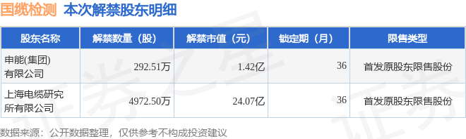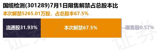 证券之星消息,根据市场公开信息整理,国缆检测(301289)于7月1日将有5265.01万股限售股份解禁,为公司首发原股东限售股份,占公司总股本67.5%。(本次数据根据历史公告整理得出,实际情况以上市公司最新公告为准)本次解禁后,公司还有44.79万股限售股份,占总股本0.57%。具体如下图所示: